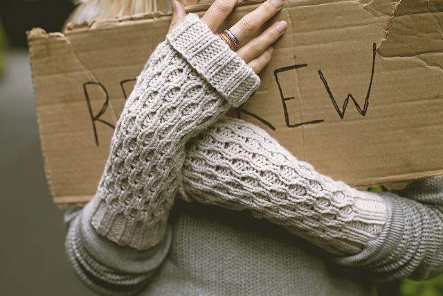 Spate by Jane Richmond. I love the cables on these mitts, as well as the length of the mitts and the folded top cuff. Beautiful! It’s knit in worsted weight on size 7 and 8 needles, so it should be a quick knit. The samples are shown in Sincere Sheep Bannock, which is 100% Targhee wool.  I loooooove Targhee! It is sproingy and it’s perfect for texture!
