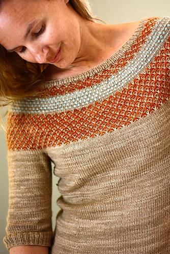 Julia Trice’s Yukiya Pullover has been in my Ravelry favorites for a long time. I love its fluid lines and use of color.  It’s so flattering! The yarn it is shown in here is Shalimar Yarns Paulie (60% Merino, 20% Camel, 10% Silk, 10% Cashmere). Wouldn’t that be lovely against the skin? I really, really want to find the time to make this!!!