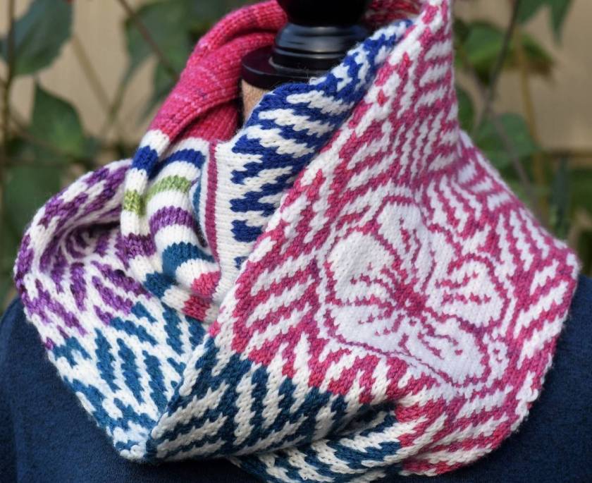 These bright colors, along with the stitch pattern Abstract Diamonds, drove the inspiration for me. I added an original colorwork design, the large flower motif – my “license for self-expression” – and the Garden Cowl emerged.