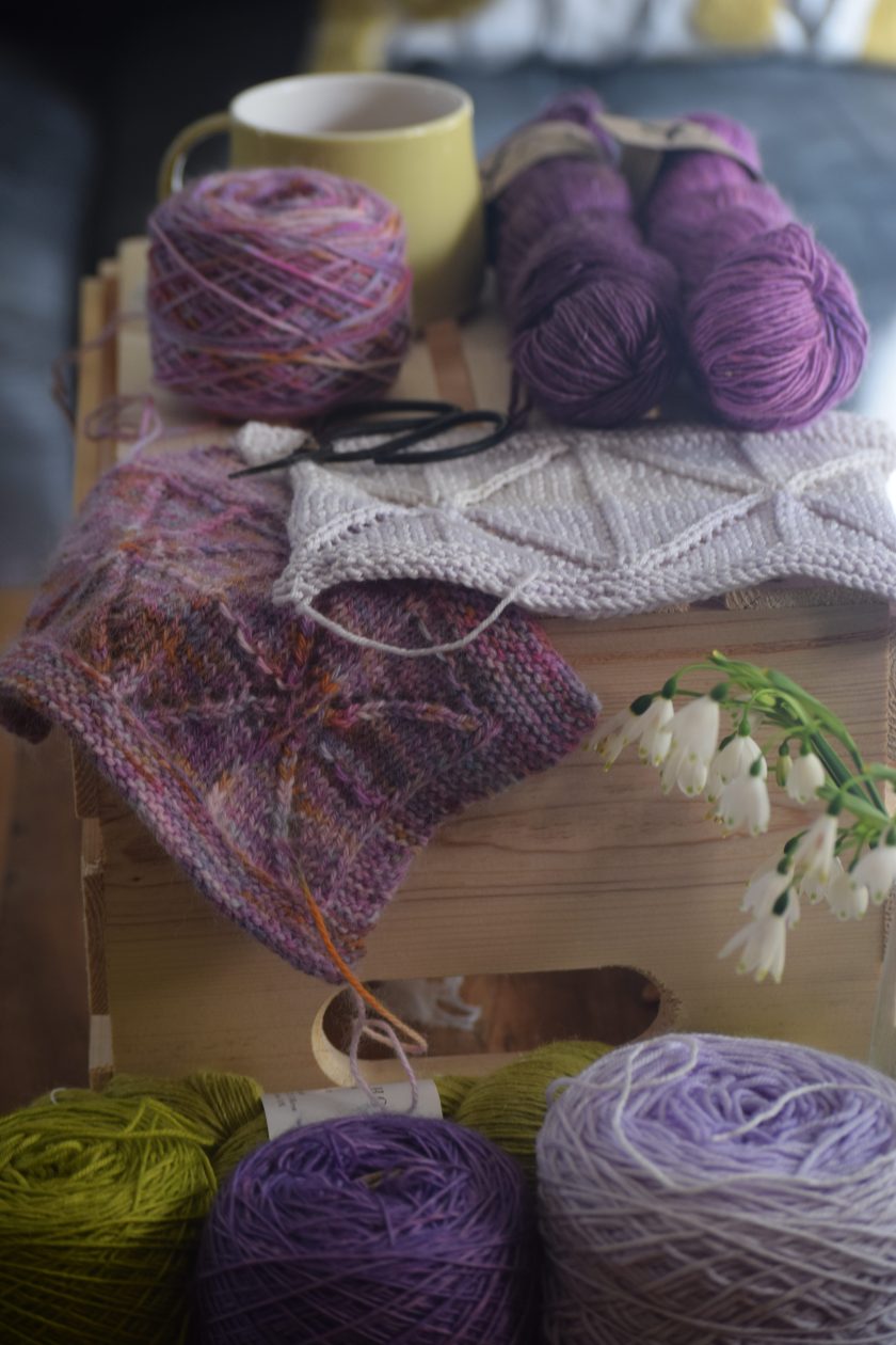 I’m taking part in The 100 Day Project. The goal is to spend about 15 minutes each day on one’s art. I decided to give it a shot and to incorporate knitting, photography, painting, sketching and even computer charting in the 100 days. I have been having a lot of fun with the spring greens and purples here and was designed-inspired by a dream, as well. I’m not very far into the 100 days, and I’m trying to document my progress on Instagram (see link in sidebar if you are intested in following).