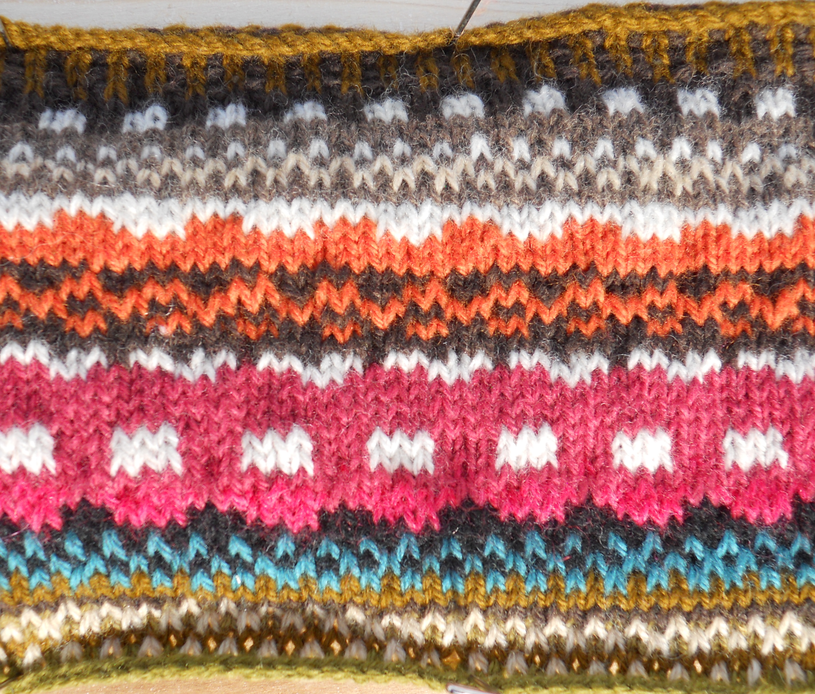 Next I learned that if I initially don’t like a color, such as the Rose colorway in the swatch above, knitting lots of it will never make me miraculously like it. Why did I think that knitting more of that pale pinky-red would make me like it more? (Just to clarify, there’s nothing wrong with the color, I just wasn’t happy with the way it looked with the other colors.)