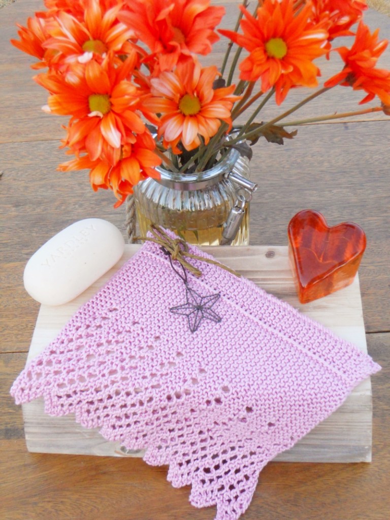 Fairy Godmother’s Spa Cloth is knit sideways, creating a pampering and luxuriant spa cloth. The pattern is named after a vintage lace stitch pattern, Godmother’s Edging. This is a good beginning lace project and makes a lovely gift.