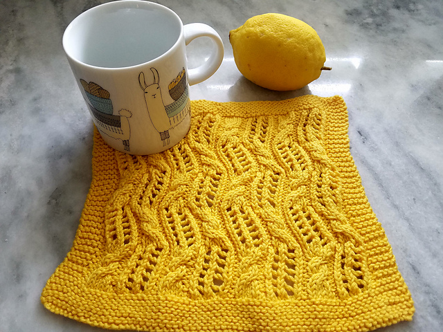 Wibbly Wobbly Spa Cloth is a luxurious, pampering facial cloth. The cable and lace stitches create a lovely design with the practical result of a fabric that provides gentle cleansing and exfoliation. Made in the suggested yarn, it can be machine washed and dried.