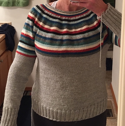 When my youngest son was in high school, I found a sweater for him that I absolutely loved. It was your basic seamed, striped sweater, but the colors and order of the stripes made me happy every time I saw that sweater. I mimicked that stripe sequence in the gray/orange/blue/red version of this sweater.