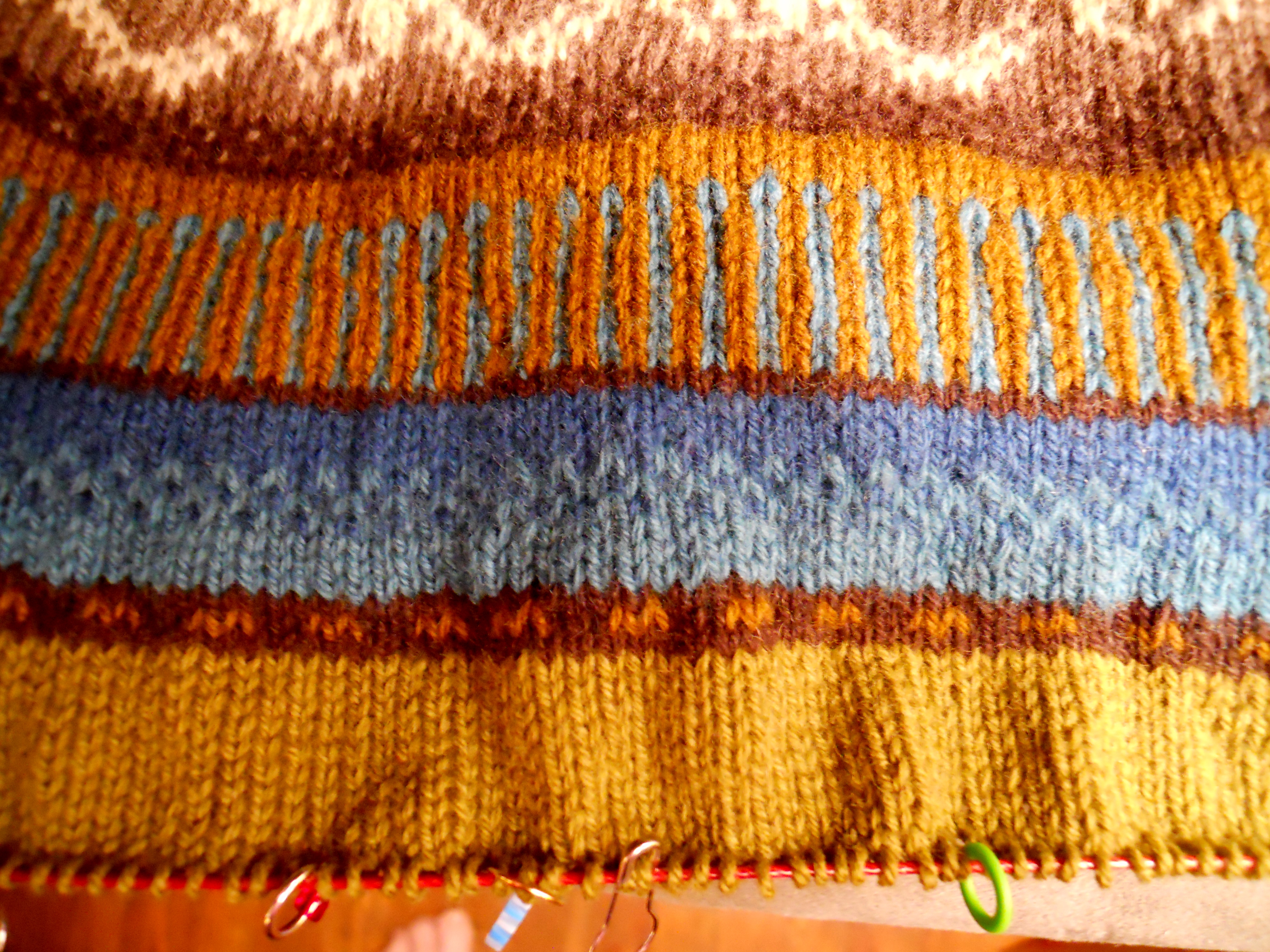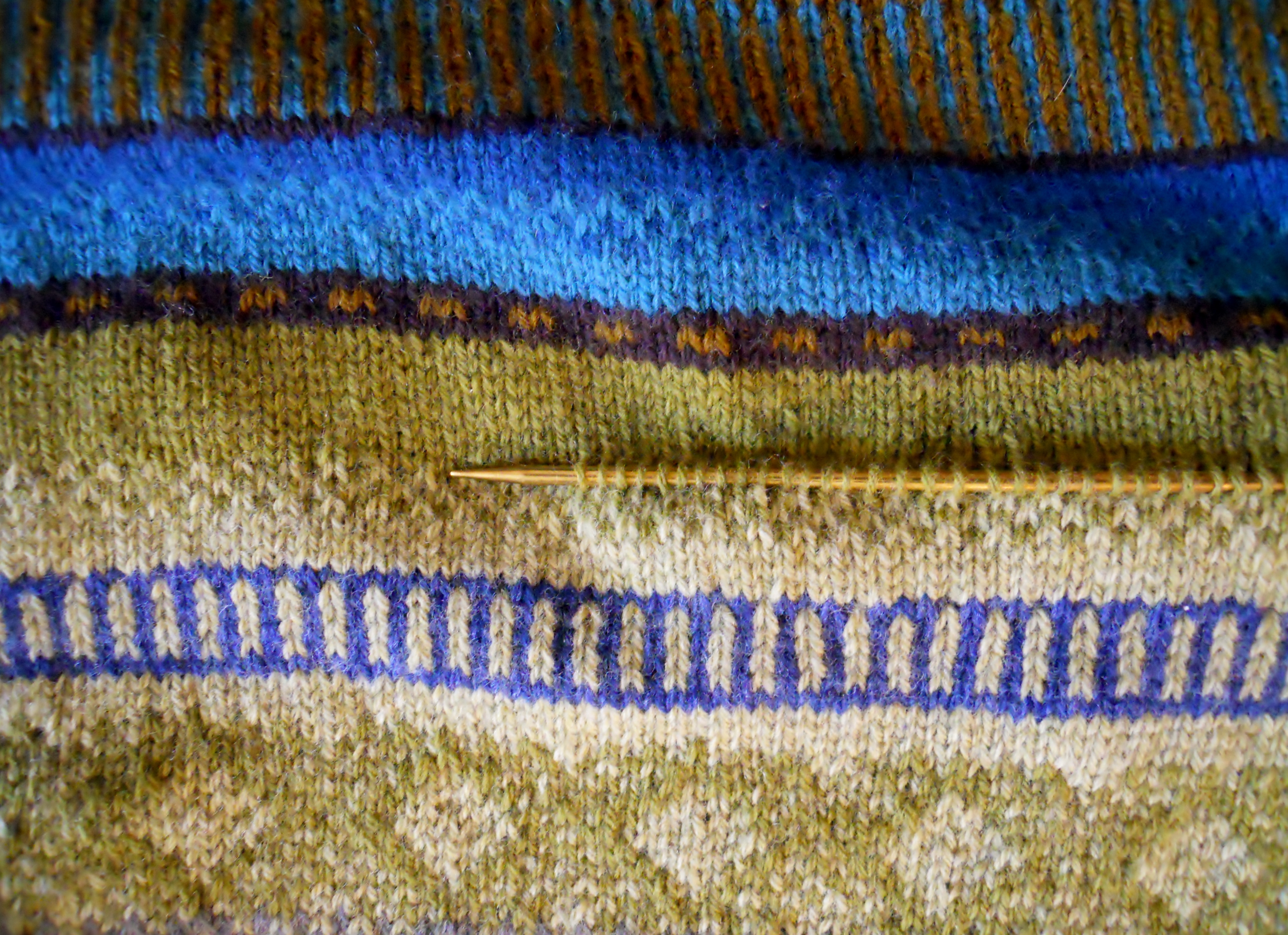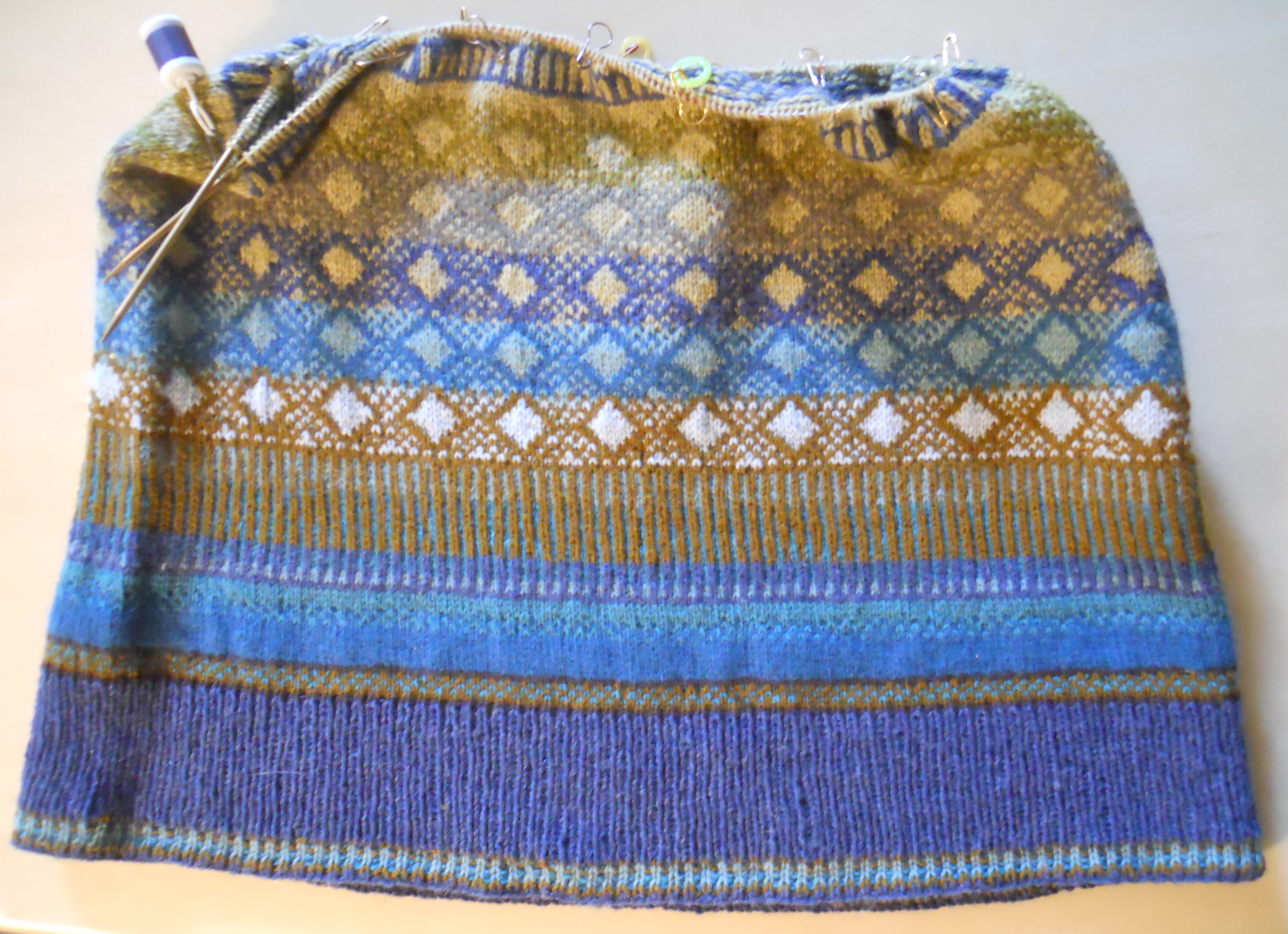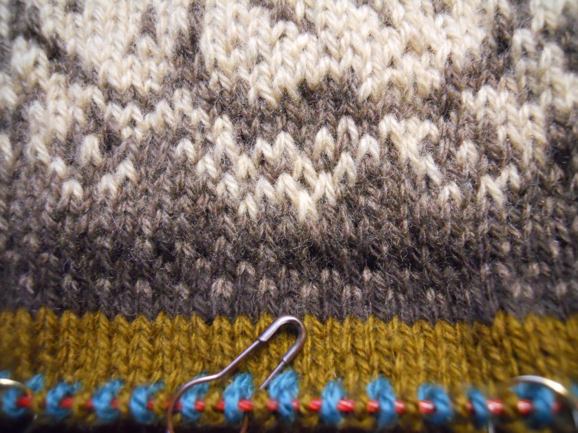 Note: This post was written a couple of months ago, in July. The pattern is still in time-out. Other patterns have been written. Is it time to move on? We’ll see…I’m still considering other methods of construction and other variations for the colorwork sections – kicking those ideas around to see if they will coalesce into something new.