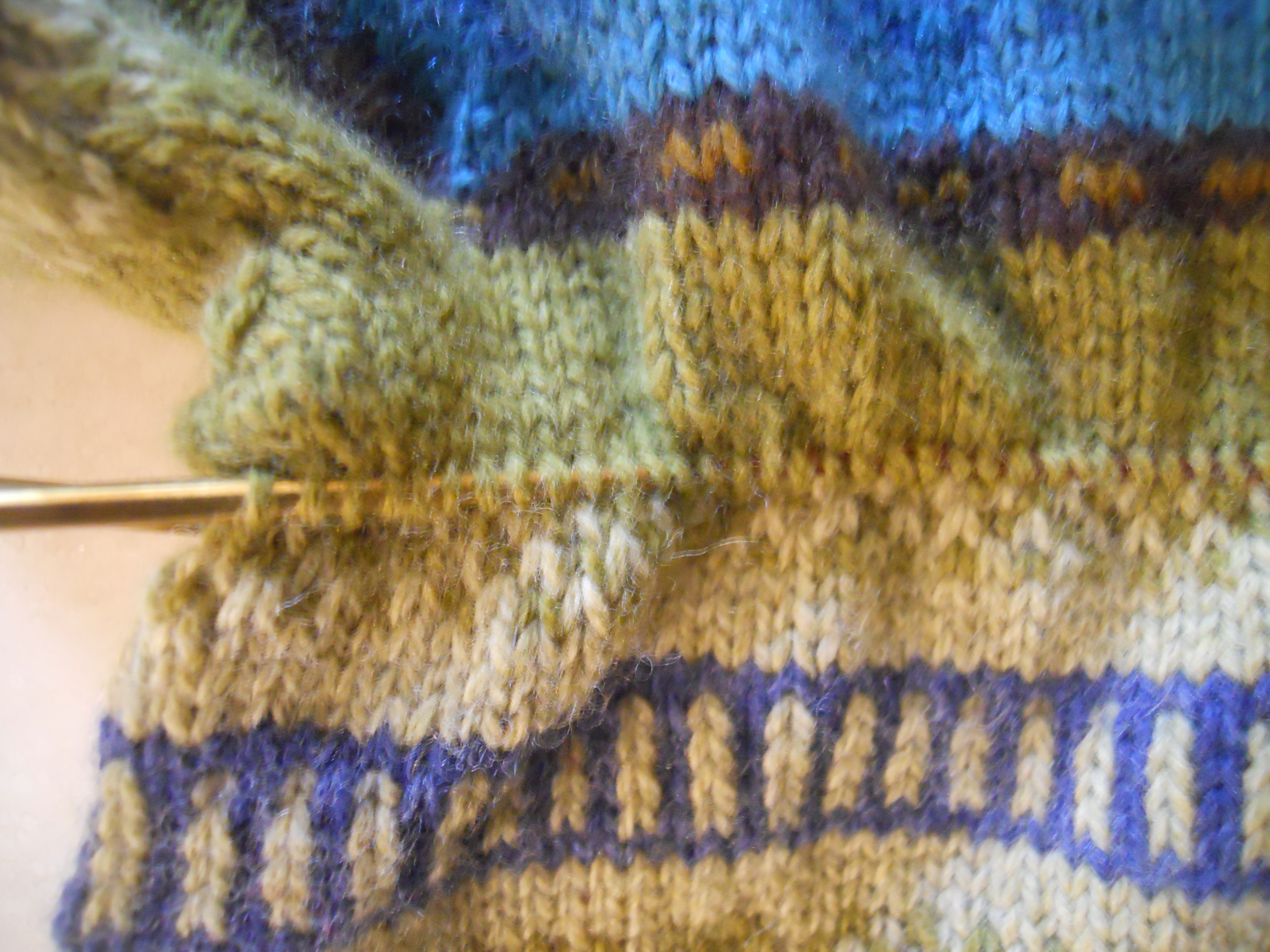 I’m not even going to show you the old yoke and sleeves, but here’s the section of the first sweater that I loved and kept. I could have continued knitting from the new yoke and sleeves and have knit all those rounds again, but…I thought that I had a better idea…grafting!