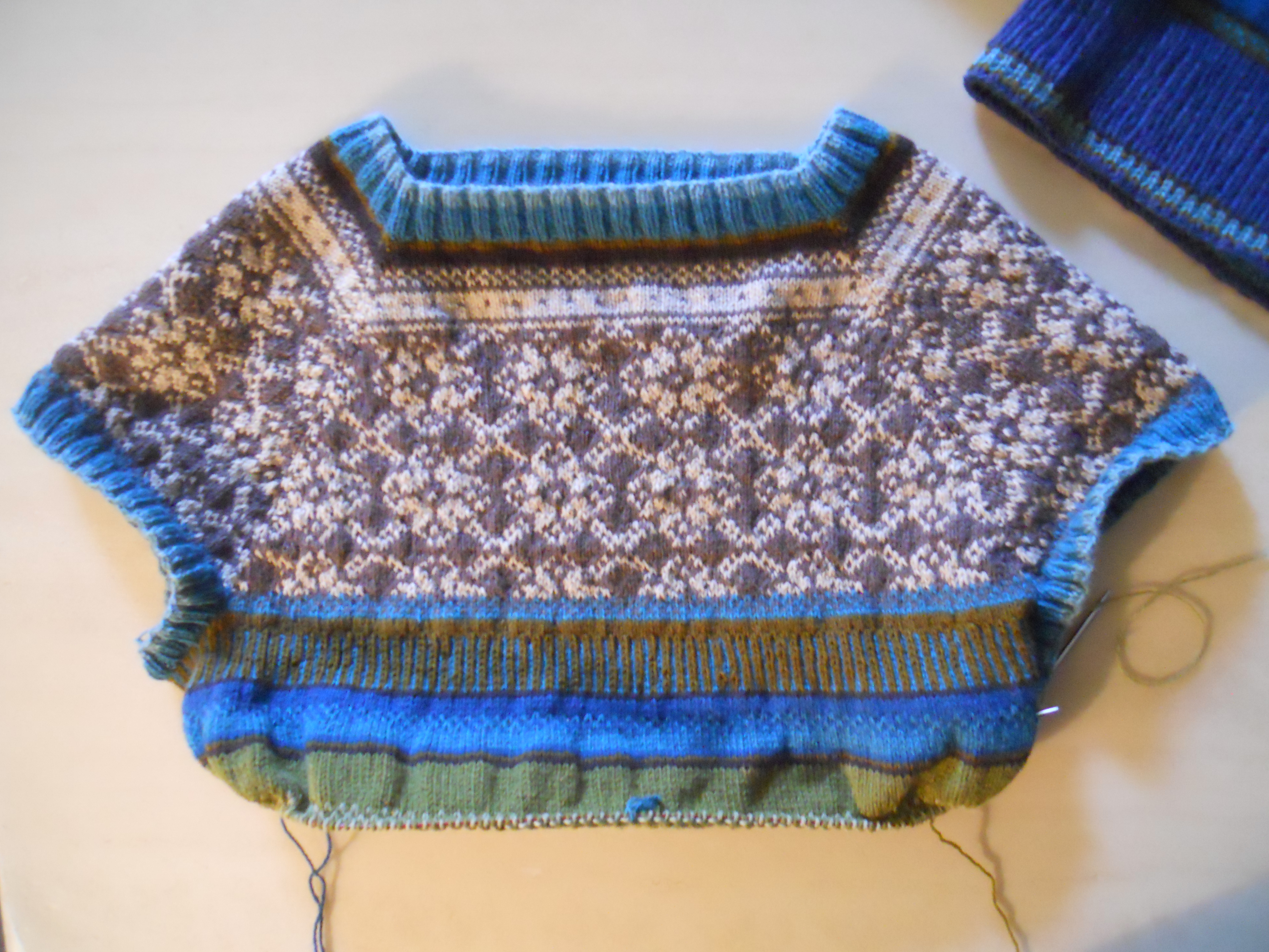 And I am so thrilled to be working on the colorwork tee again. Christmas knitting, among other things, took me away from it. But I’m back! And my tension is more even now. Woot! I am hopeful that testing can begin on it once I have placed the sleeves on waste yarn and joined for the body.