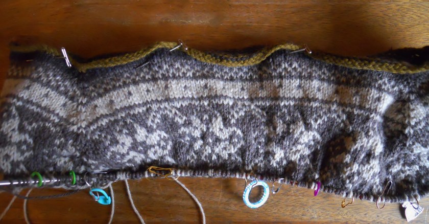 And I am so thrilled to be working on the colorwork tee again. Christmas knitting, among other things, took me away from it. But I’m back! And my tension is more even now. Woot! I am hopeful that testing can begin on it once I have placed the sleeves on waste yarn and joined for the body.