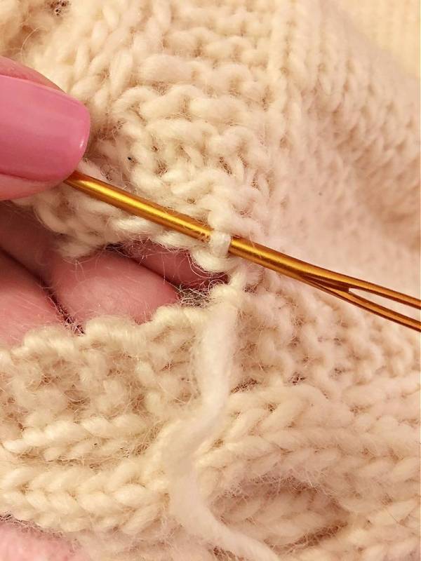 To create this seam, use your tapestry needle to run the yarn under the bars between the stitches on the stockinette edges and under the outermost loops on the garter stitch edges. Sometimes you have to dig around a little to find the bar between the stitches on the stockinette edge. Keep trying, though; it’s in there!